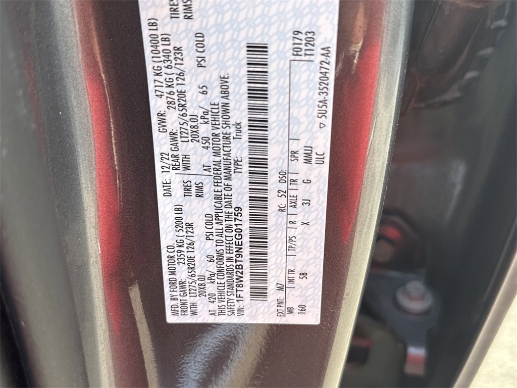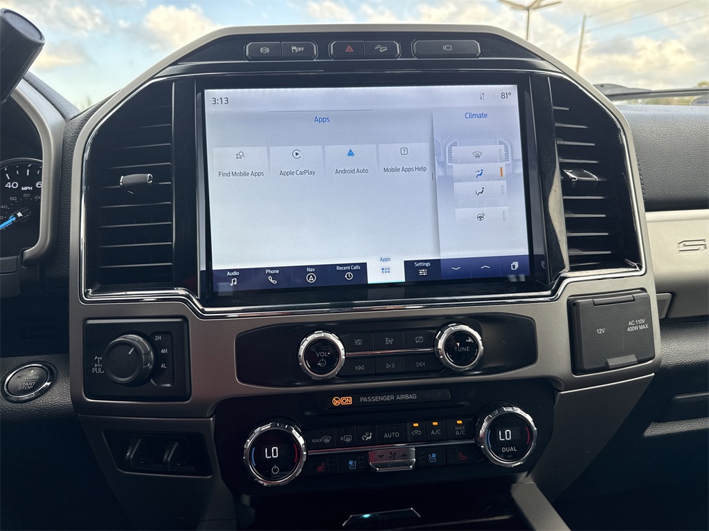 t Ultimate Package (Ambient Lighting - Fixed Color, Easy Entry®/Exit Memory Driver's Seat Feature, Intelligent Access w/Push-Button Start, LED Box Lighting, Memory Power-Adjustable Pedals, Power Heated/Ventilated Driver Seat w/Memory, Power Heated/Ventilated Passenger Seat, Power Telescoping/Tilt Steering Wheel/Column, PowerScope Trailer Tow Mirrors w/Memory, Remote Start System, Remote Tailgate Release, and Tailgate Step & Handle), Order Code 608A, 4WD, 10 Speakers, 4-Wheel Disc Brakes, 6" Angular Bright Polished Step Bar, ABS brakes, Adjustable pedals, Advanced Security Pack Inclination Sensor Removal, Air Conditioning, Alloy wheels, AM/FM radio: SiriusXM with 360L, Auto High-beam Headlights, Auto-dimming Rear-View mirror, Automatic temperature control, Brake assist, Bumpers: chrome, Compass, Delay-off headlights, Driver door bin, Driver vanity mirror, Dual front impact airbags, Dual front side impact airbags, Electronic Stability Control, Emergency communication system: SYNC 4 911 Assist, Engine Block Heater, Exterior Parking Camera Rear, Flow-Through Console, Front anti-roll bar, Front Bucket Seats, Front Center Armrest, Front dual zone A/C, Front fog lights, Front Leather Seating Surfaces 40/Console/40, Front reading lights, Fully automatic headlights, Heated door mirrors, Heated Steering Wheel, Illuminated entry, Leather steering wheel, Low tire pressure warning, Navigation system: Connected Navigation, Outside temperature display, Overhead airbag, Overhead console, Panic alarm, Passenger door bin, Passenger vanity mirror, Power door mirrors, Power driver seat, Power passenger seat, Power steering, Power windows, PowerScope Trailer Tow Mirrors w/Heat, Radio data system, Radio: B&O Sound System by Bang & Olufsen, Rain-Sensing Windshield Wipers, Rear CHMSL Camera, Rear Parking Sensors, Rear reading lights, Rear seat center armrest, Rear step bumper, Rear window defroster, Remote keyless entry, Security system, SiriusXM Radio w/360L, Speed control, Split folding rear seat, Steering wheel mounted audio controls, SYNC 4 w/Enhanced Voice Recognition, Tachometer, Telescoping steering wheel, Tilt steering wheel, Traction control, Trip computer, Turn signal indicator mirrors, Universal Garage Door Opener (UGDO), Upfitter Switches (6), Variably intermittent wipers, Wheels: 18" Bright Machined Cast Aluminum, and Wheels: 20" Bright Machined Cast Aluminum.